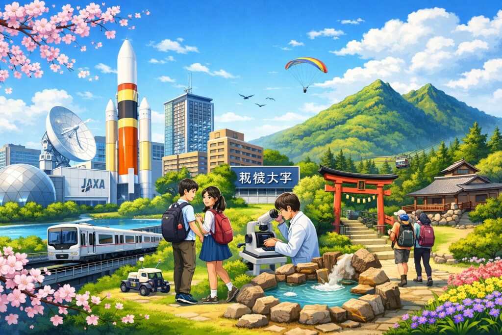 市内には筑波大学やJAXA筑波宇宙センターなど多くの研究機関が集まり、最先端の科学や教育の拠点となっています。