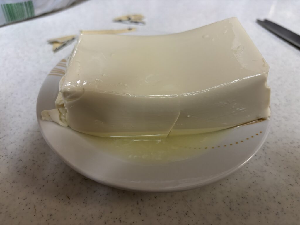 次に、冷蔵庫で冷やしてから食べてみると、甘みが少し落ち着き、そのぶん大豆のコクや旨みがしっかりと感じられるようになり、常温の時の崩れそうな柔らかさはなく、豆腐自体に適度な硬さが出て、食感もしっかりとしました。