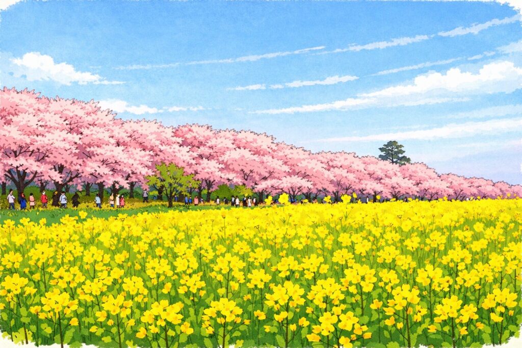 幸手市といえば、関東有数の桜の名所「権現堂桜堤」 が有名で、約1kmにわたるソメイヨシノと菜の花のコントラストは春の絶景スポットとして多くの人を惹きつけています。