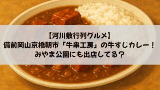 旅先グルメ 【河川敷行列グルメ】備前岡山京橋朝市「牛串工房」の牛すじカレー!みやま公園にも出店してる? 岡山の名物朝市「備前岡山京橋朝市」では、早朝から200人もの行列ができるほどの大人気店「牛串工房」があります。メニューは牛すじカレー、ホルモンカレー、あいがけカレーの3種類ですが、500食が完売するほどで、早朝から並ばないと食べることができ... 2026.02.22 旅先グルメ