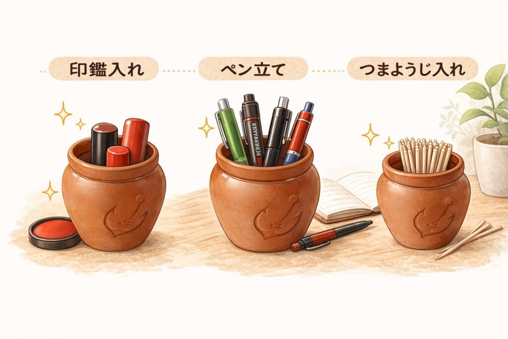 壺が陶器製で重さがあるため、ペン立てとしても安定して使うことができます。